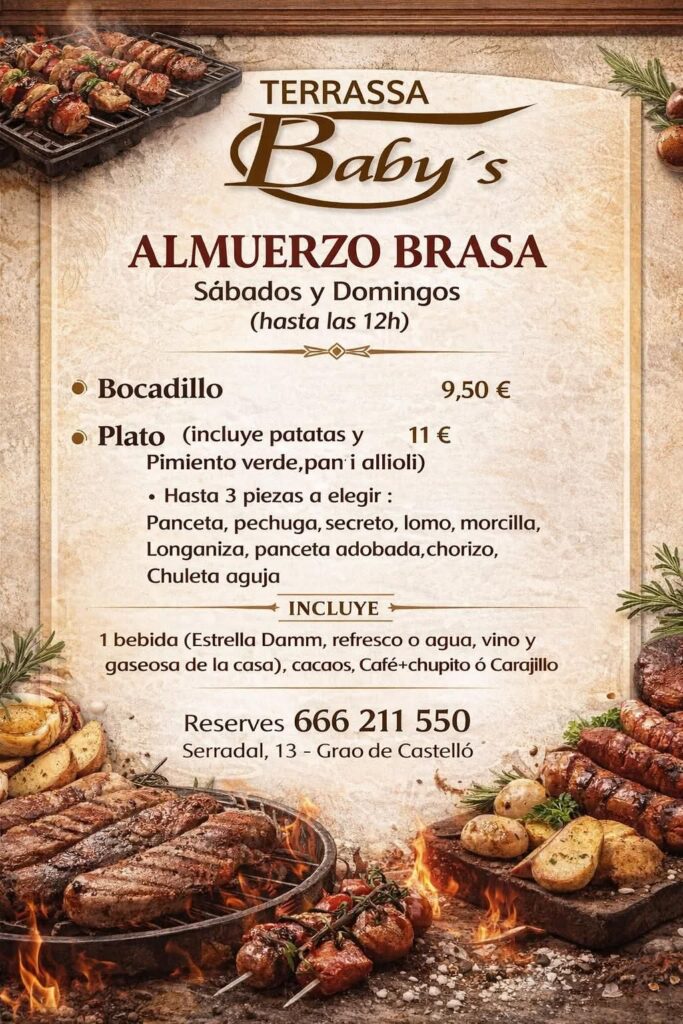 Almuerzos en plato o bocadillo y brasa sábado y domingo.